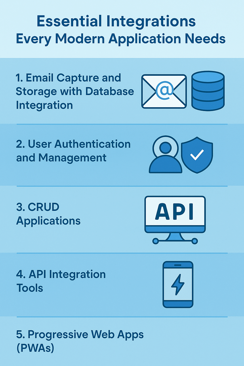 These five integration categories represent the foundation of modern application development. While specific tools and technologies continue to evolve, the underlying needs they address remain constant: capturing and managing user data, securing access, manipulating information, connecting services, and delivering seamless experiences across devices.