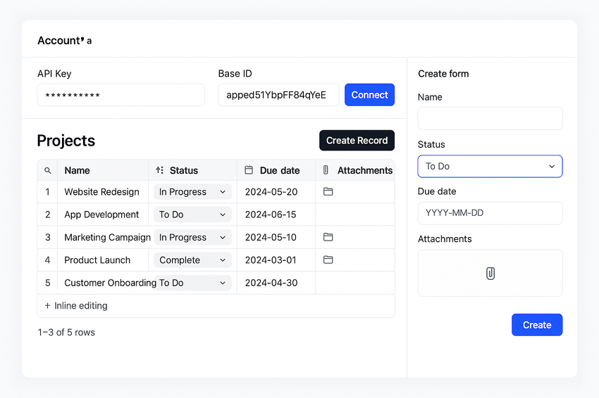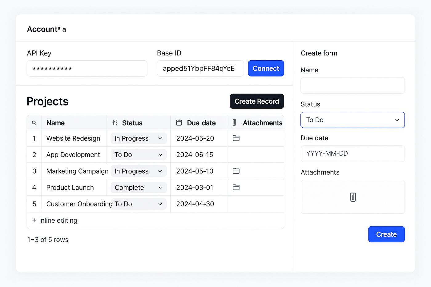 "Create an Airtable integration that connects to a base using API key and base ID. Fetch records from a specified table and display them in a data grid with sorting and filtering. Add inline editing capability that sends PATCH requests to update records. Include a create form that adds new records to Airtable and refresh the view automatically. Handle Airtable field types including attachments, select fields, and linked records."