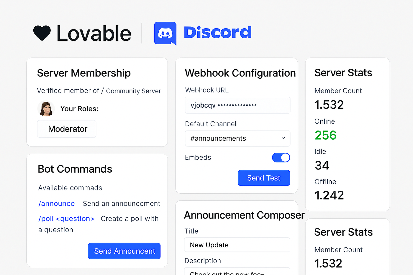 Most teams duct-tape Discord comms with manual copy-paste and role chaos. Lovable standardizes it: verified logins, clean webhooks, documented commands, live server health, and RBAC that maps Discord roles to app capabilities. Less friction, more signal, and measurably better community ops.