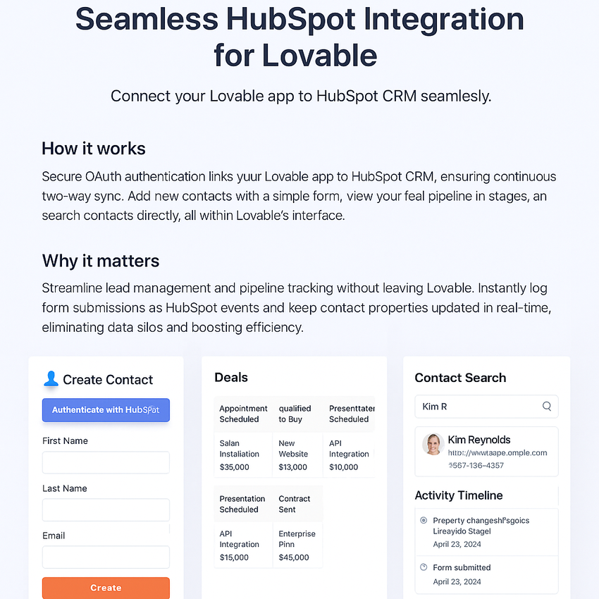 Connect your Lovable app directly to HubSpot CRM for frictionless contact management, deal tracking, and real-time data sync.