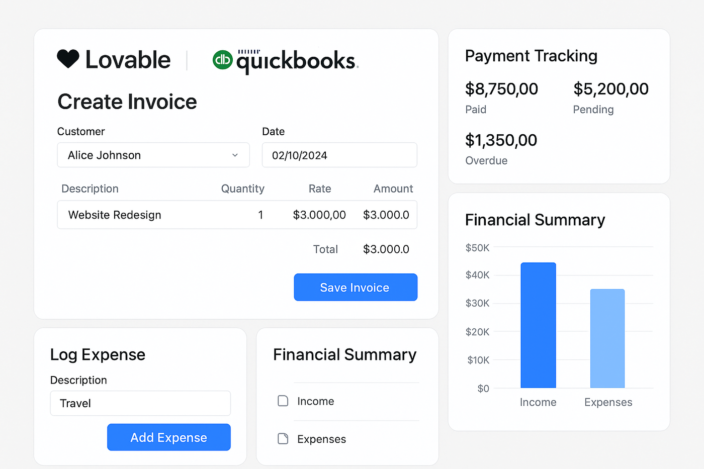 With Lovable + QuickBooks, finance becomes part of your product workflow—not an afterthought.