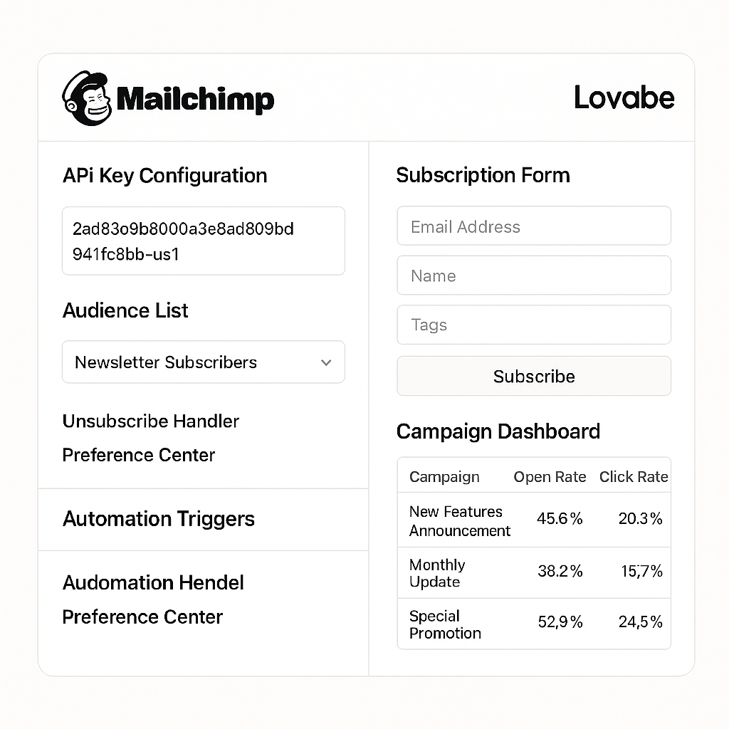 Lovable securely stores your Mailchimp credentials, allowing instant synchronization between your users and campaigns. Create subscription forms that capture names, tags, and interests, and push them to Mailchimp audiences automatically.