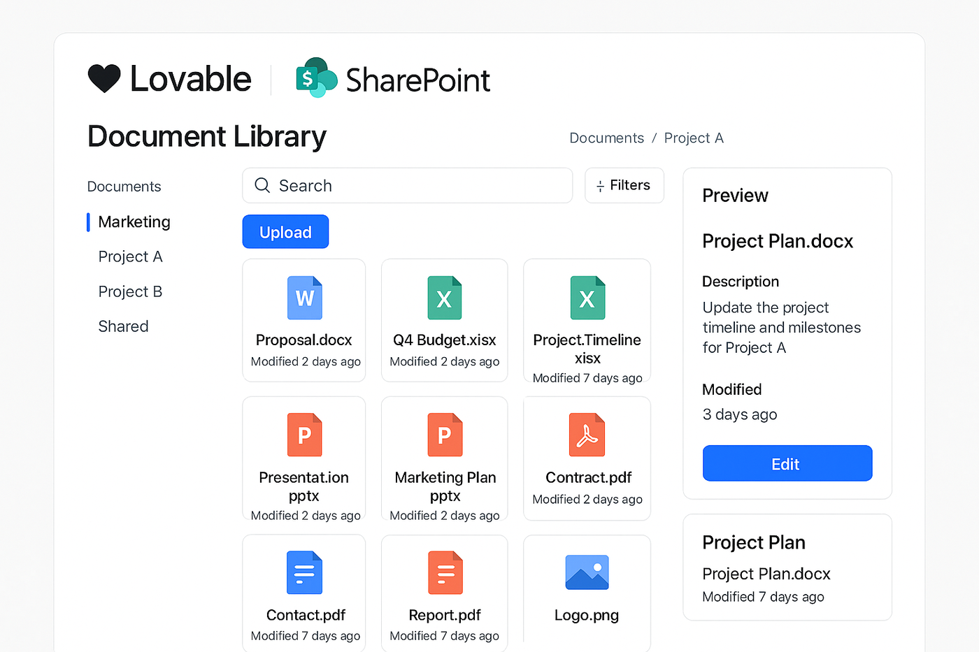 Browse, search, preview, and edit SharePoint content—without leaving Lovable.