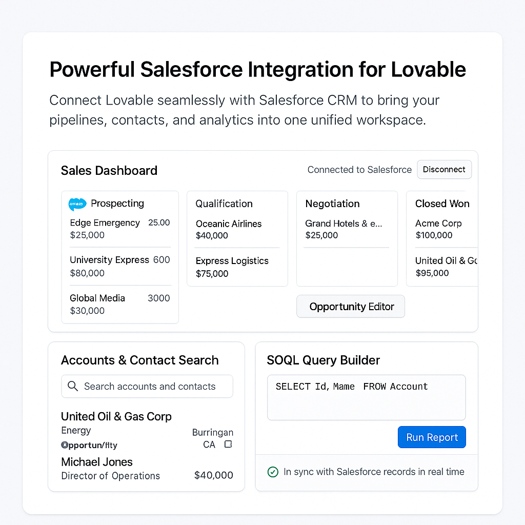 Connect Lovable seamlessly with Salesforce CRM to bring your pipelines, contacts, and analytics into one unified workspace.