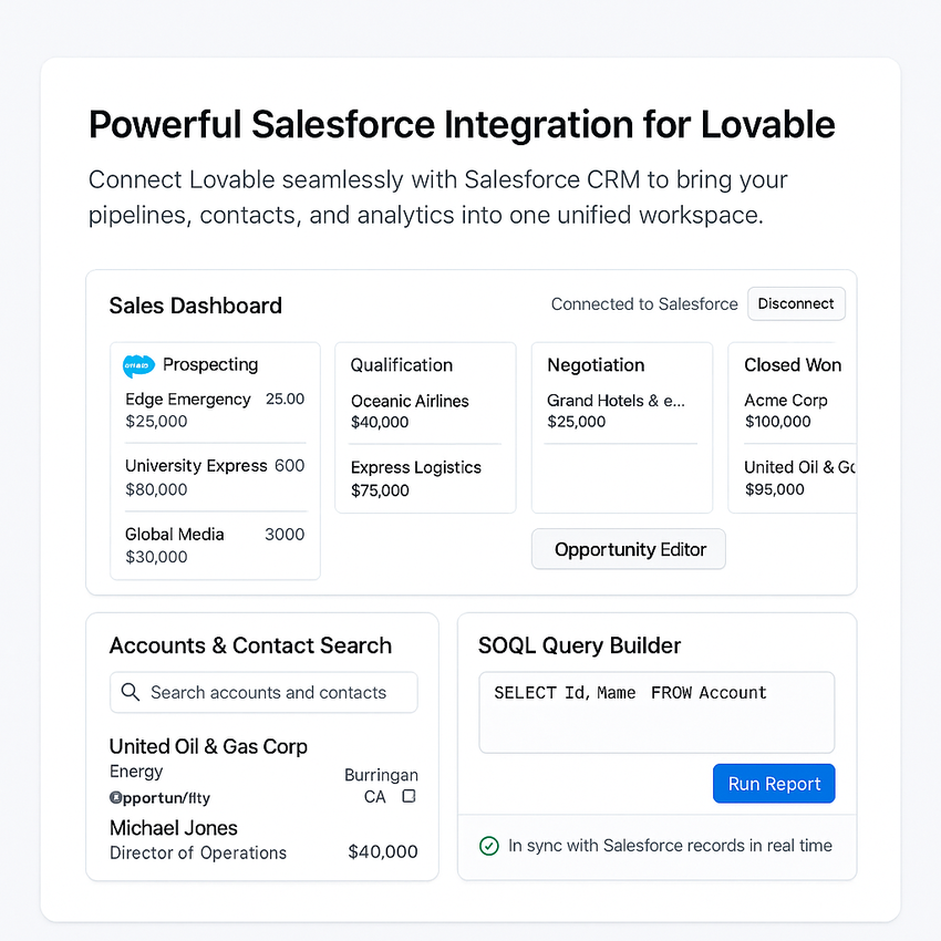 For advanced users, the integration provides a SOQL Query Builder, allowing teams to construct custom Salesforce queries through an intuitive no-code interface. This enables real-time reporting and data insights directly within Lovable, without needing to switch to Salesforce