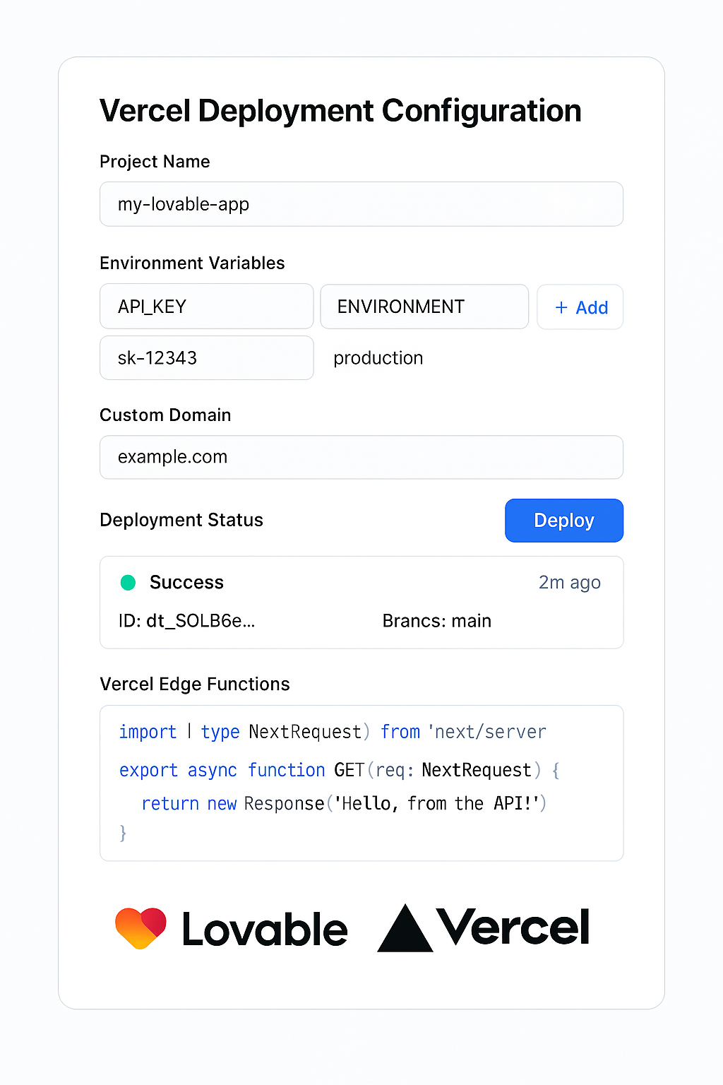"Create a Vercel deployment configuration page that helps users connect their Lovable project to Vercel. Add fields for project name, environment variables, and custom domain settings. Include a deployment status dashboard showing build logs and deployment history. Create a settings page for configuring Vercel Edge Functions with code examples. Add serverless function templates for API routes that can be deployed directly to Vercel."